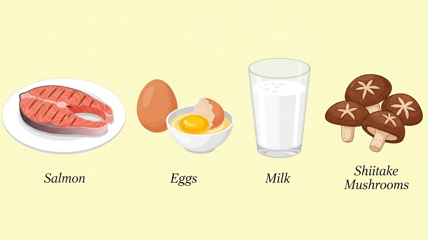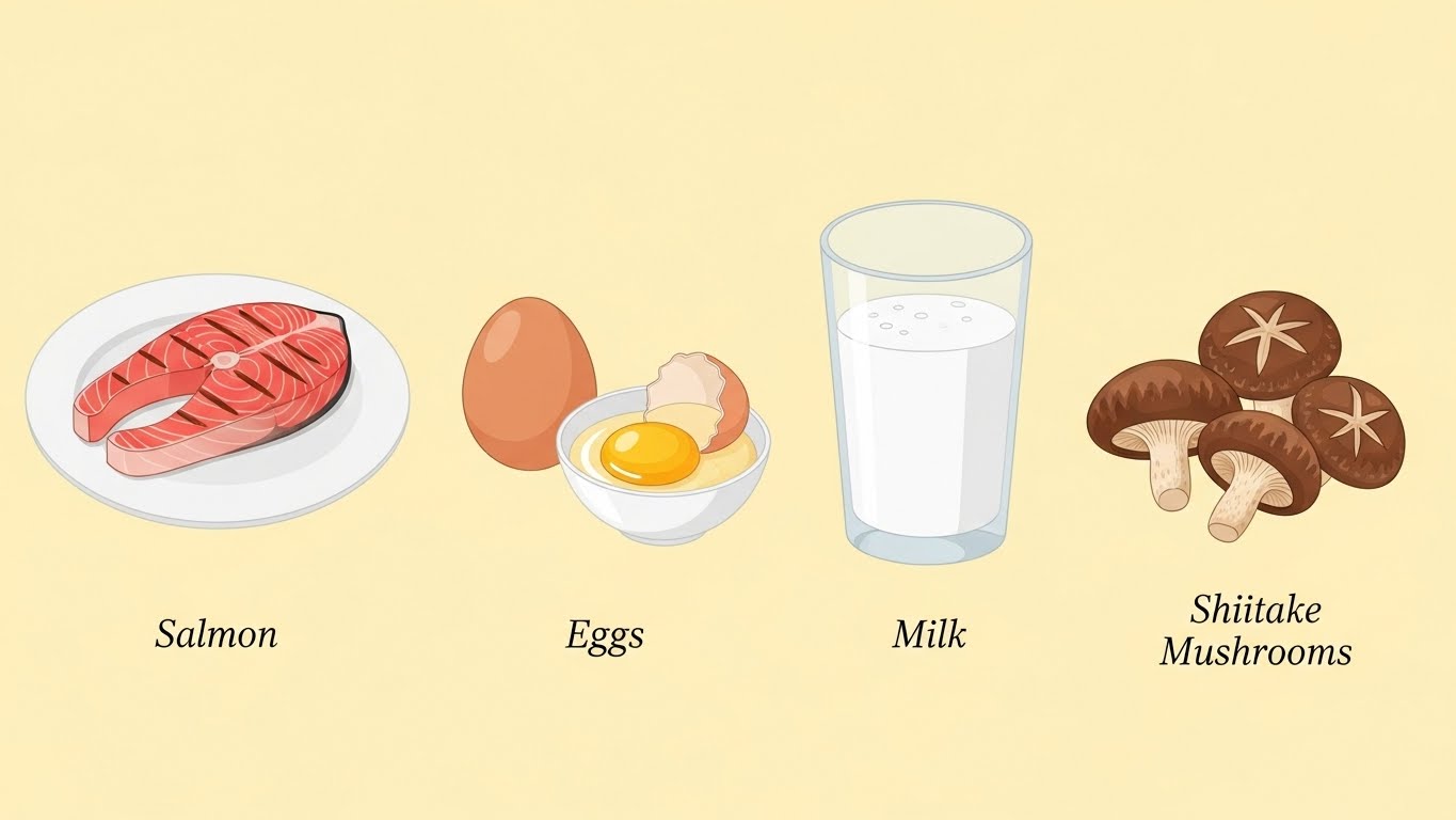 연어, 고등어, 달걀 노른자, 우유, 표고버섯 등이 대표적입니다.
